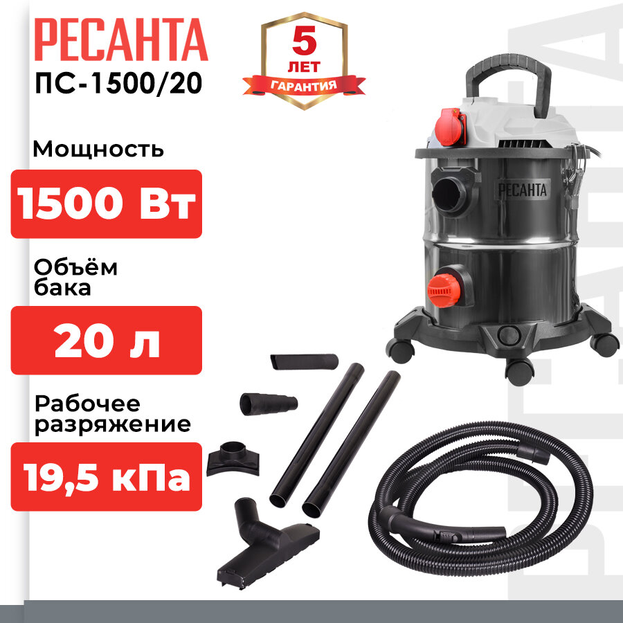 Профессиональный пылесос РЕСАНТА ПС-1500/20, 1500 Вт, серебристый