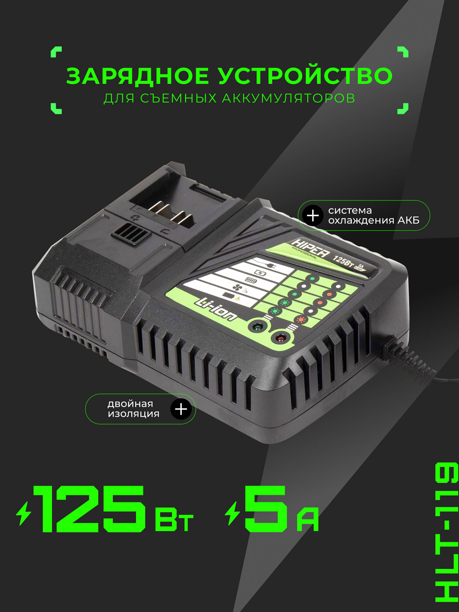 Зарядное устройство HIPER HLT-119, 125Вт, ток заряда 5А, двойная изоляция, система охлаждения АКБ, зеленый 1 200 ₽