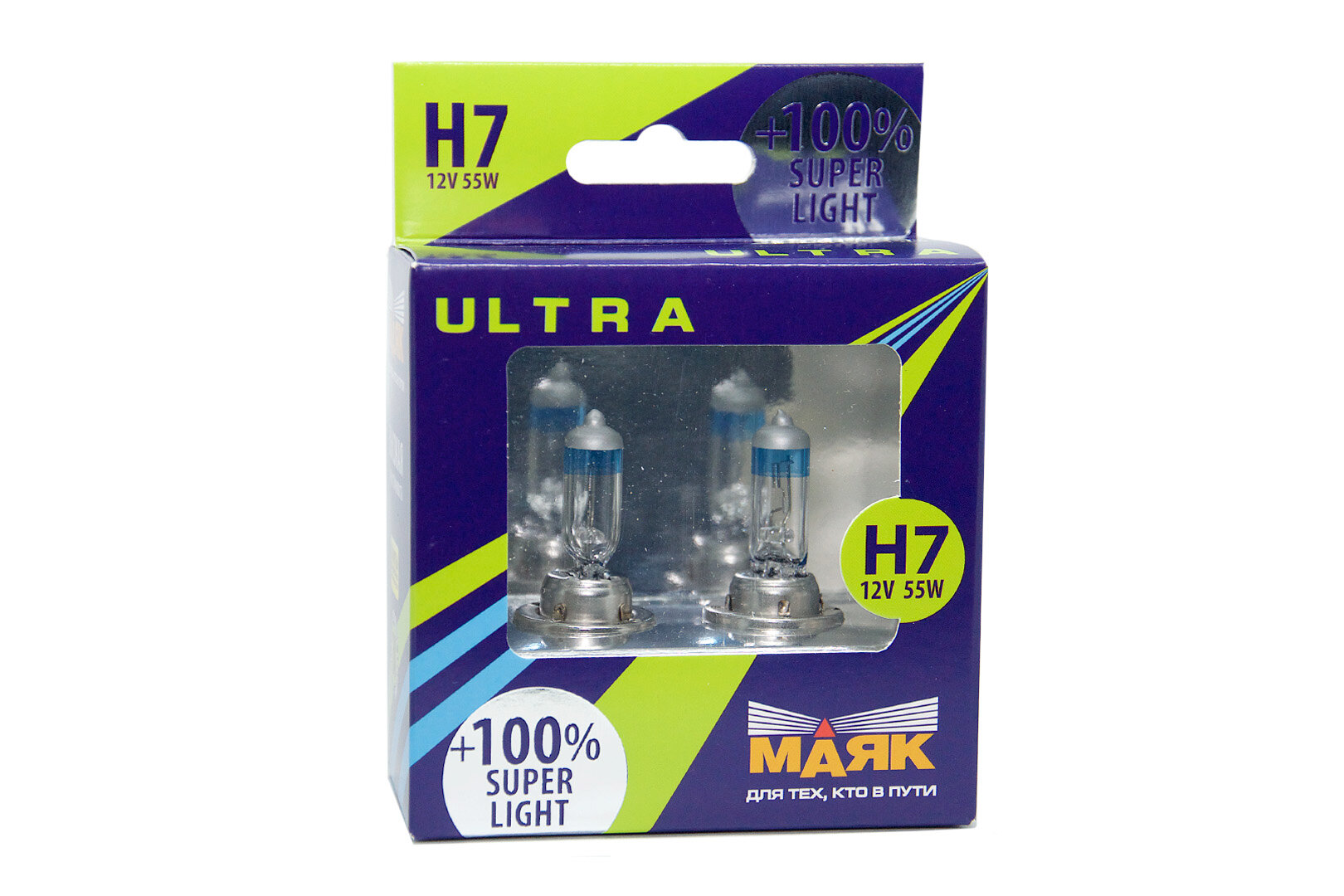 Маяк Лампа автомобильная Маяк Ультра Super Light+100%, H7, 12 В, 55 Вт, набор 2 шт