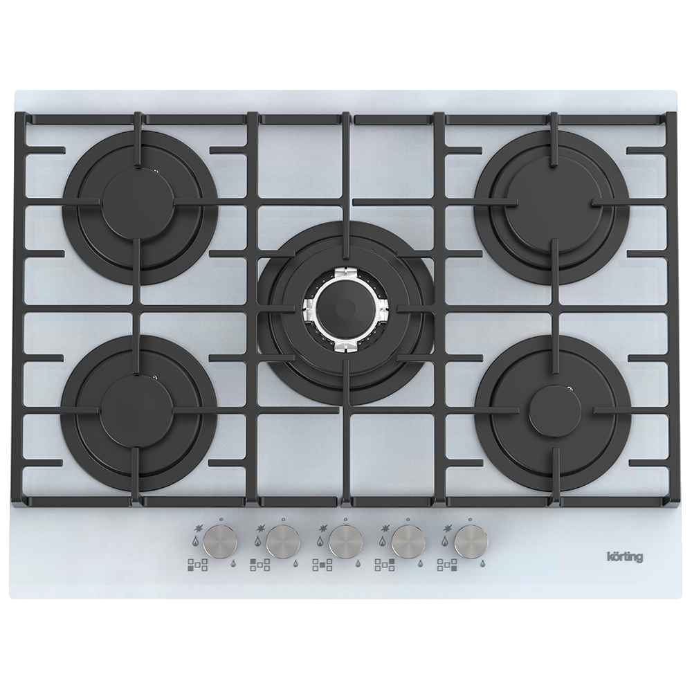 Встраиваемая газовая панель Korting/ Газовая варочная панель из закаленного стекла, ширина 70 см, 5 высокоэффективных конфорок, сверхмощная конфорка WOK 3,8 кВт, автоматический электроподжиг, газ-контроль каждой конфорки, передние металлические переключат