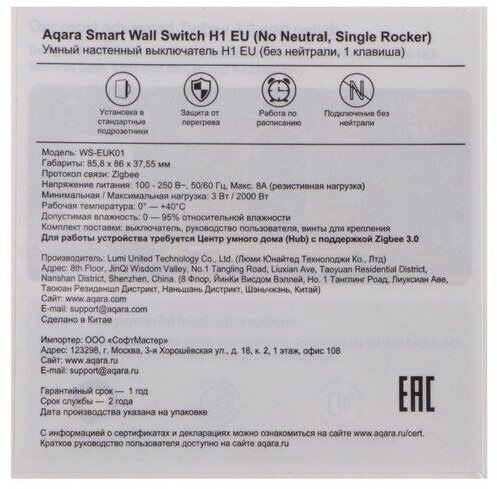 Выключатель Aqara Smart Wall Switch H1 EU 1-нокл. белый (WS-EUK01) информация: