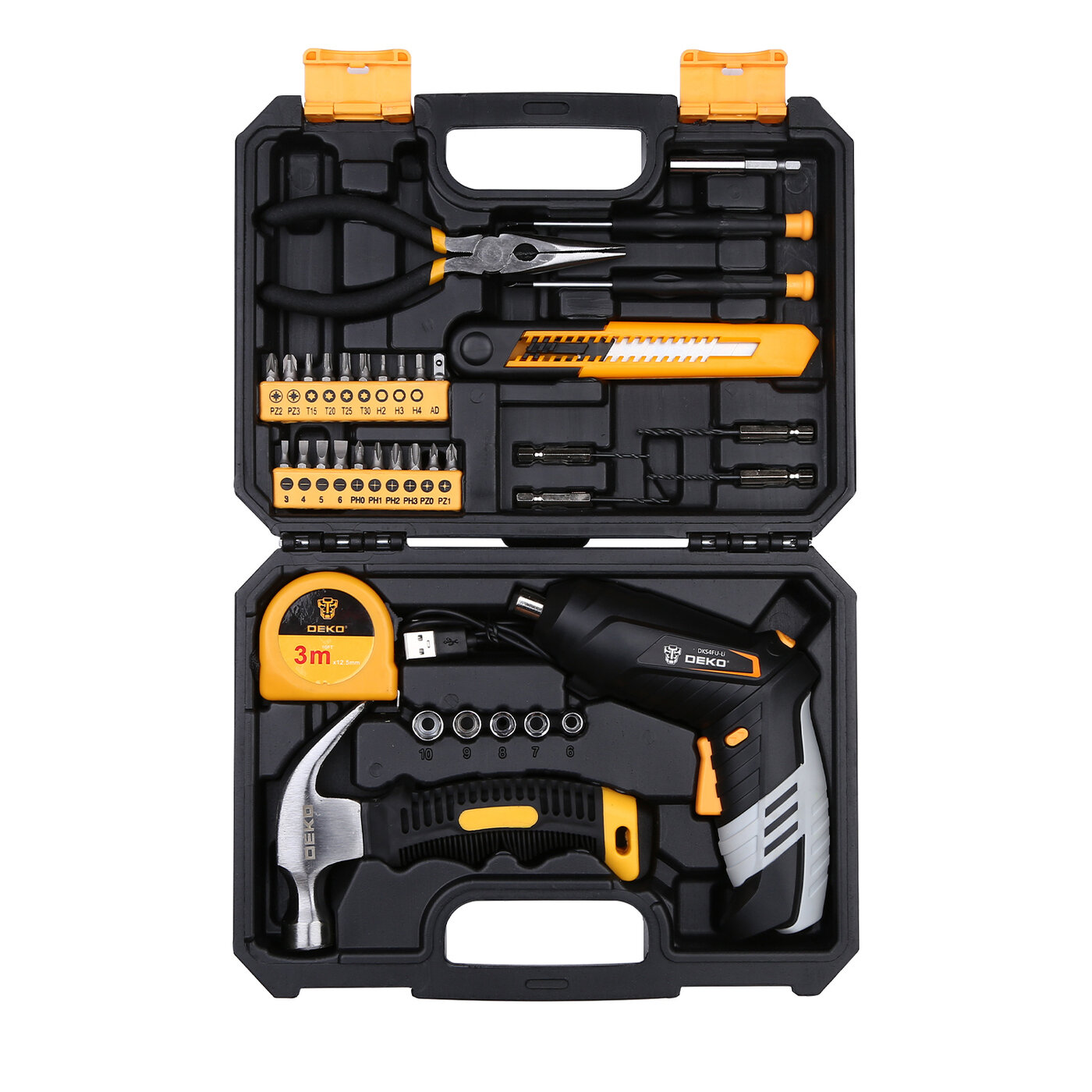 Аккумуляторная отвертка Deko DKS4FU-Li в кейсе набор инструментов 36 предметов черно-желтый