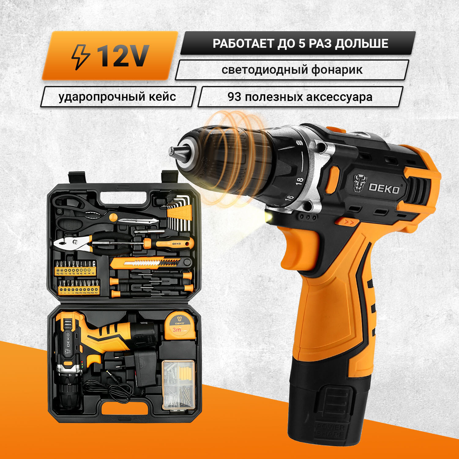 Дрель-шуруповерт аккумуляторная DEKO Banger 1*12B 2Ач Li-Ion, набор инструмента 93 предмета