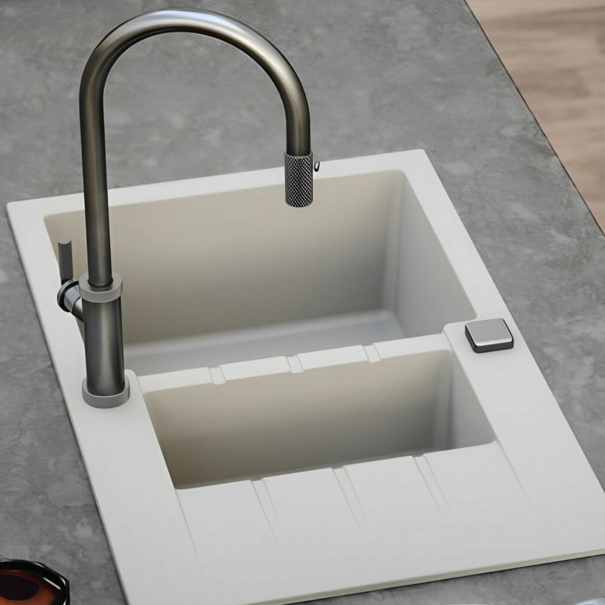 Каменная мойка для кухни с двумя чашами и крылом ALVEUS GRANITAL CADIT 70 ARCTIC - G11 790 X 500 искусственный камень гранит с сифоном. Цвет белый