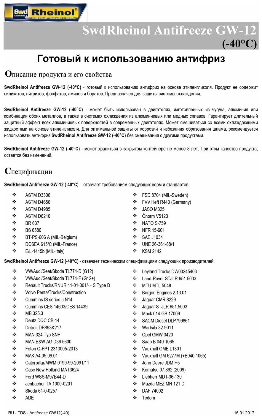 Антифриз Gw-12 (-40) Красный (5Л) SWD Rheinol арт. 39140,580 информация: