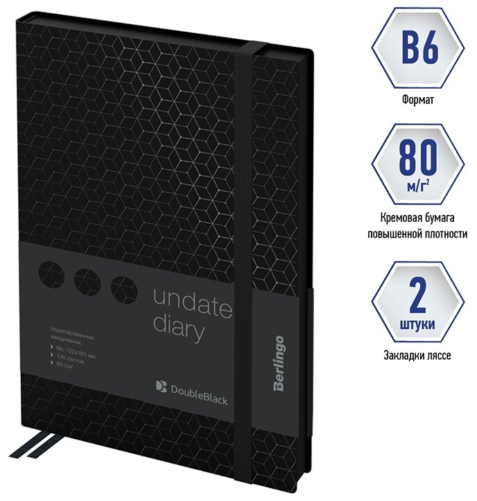 Ежедневник недатированный, B6, 136л., кожзам, Berlingo "DoubleBlack", черный срез, черный, с рисунко 4260107491989 информация: