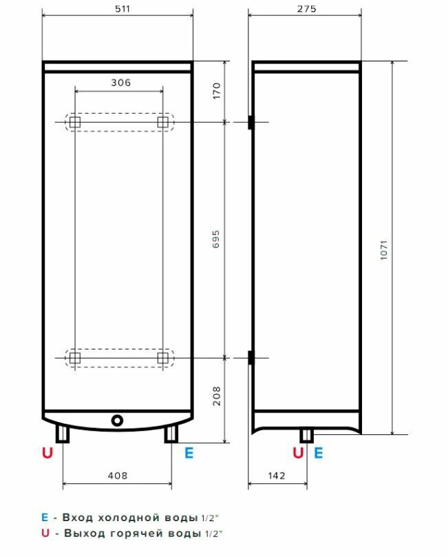 | Дополнительная информация | мин. давление воды: 0.2 бар; макс. давление воды: 6 бар; тип электрического нагревательного элемента: трубчатый; степень защиты от воды: IPX4; время нагрева всего объема (ΔT=45°С): 81 мин.; тепловые потери при 60 °С: 0,85 кВт∙ч за 24 ч; расстояние между входом холодной воды и выходом горячей воды: 408 мм |