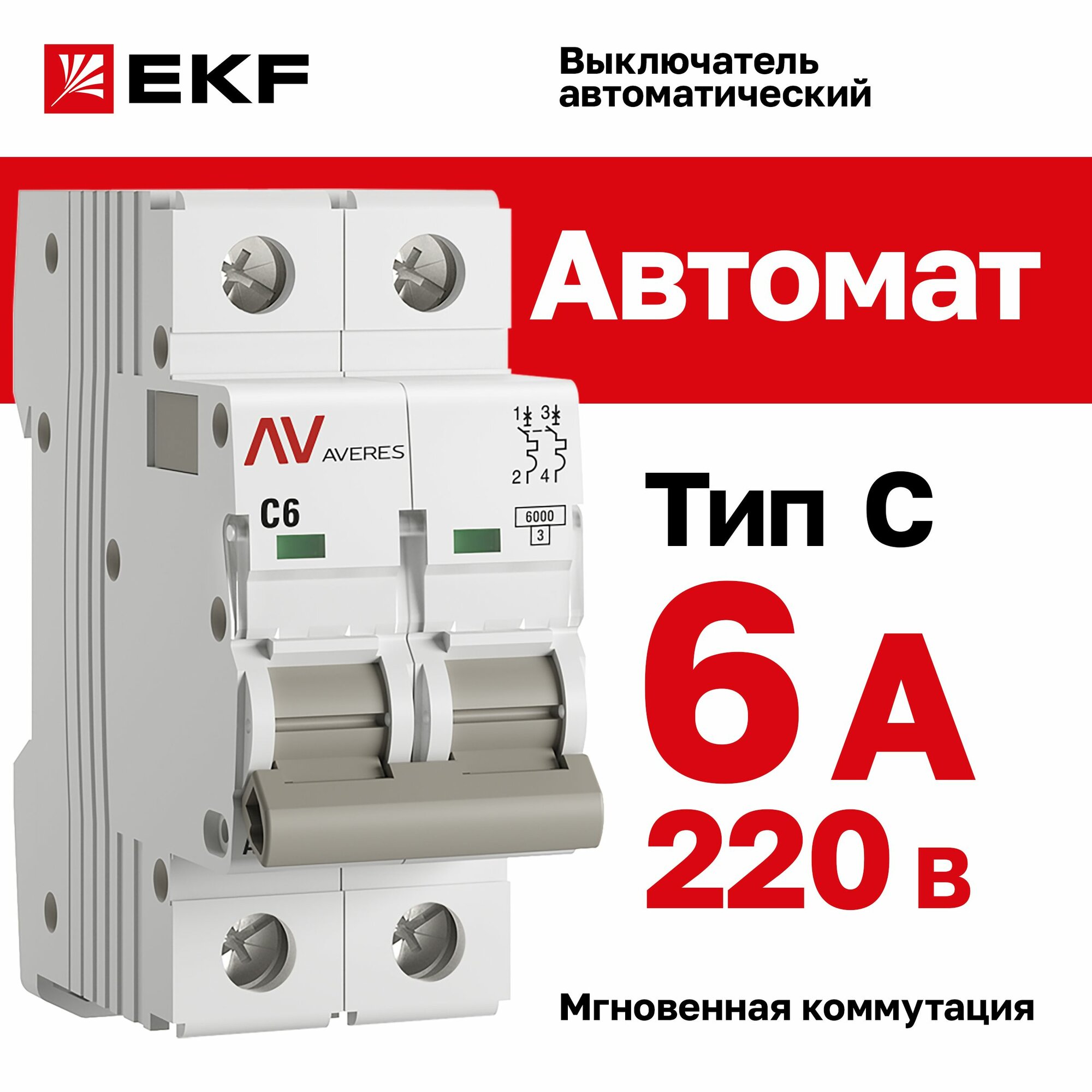 Выключатель автоматический модульный 2п C 6А 6кА AV-6 AVERES EKF mcb6-2-06C-av информация: