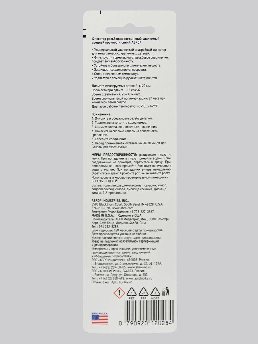 Фиксатор резьбы "ABRO" (6 г) (синий, удаляемый) информация:
