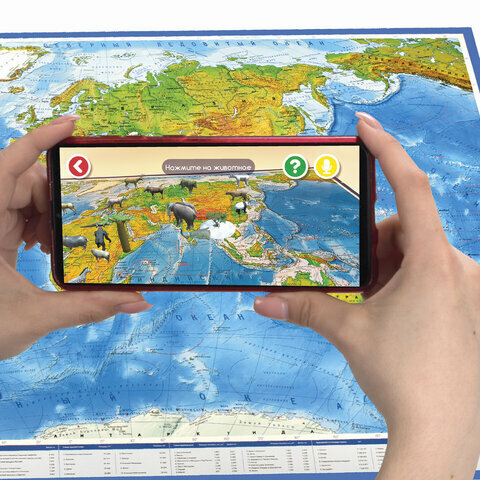Карта мира физическая "Полушария" 101х69 см, комплект 5 шт., 1:37М, интерактивная, в тубусе, BRAUBERG, 112376