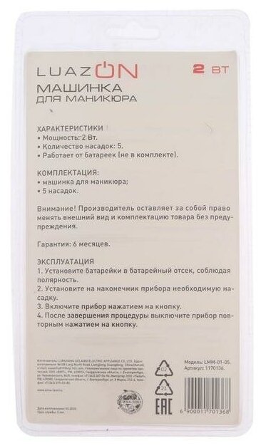 Аппарат для маникюра LuazON LMM-01-05, 5 насадок, 2хAA (не в комплекте), белый 1170136 информация: