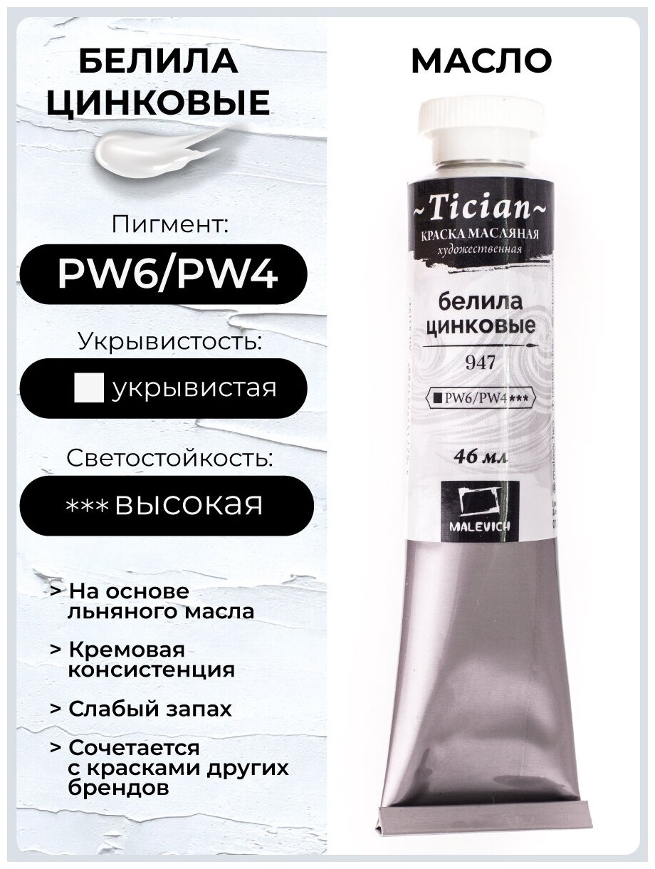Масляные Малевичъ Масляная краска Tician малевичъ, туба 46мл, 947 Белила цинковые информация: