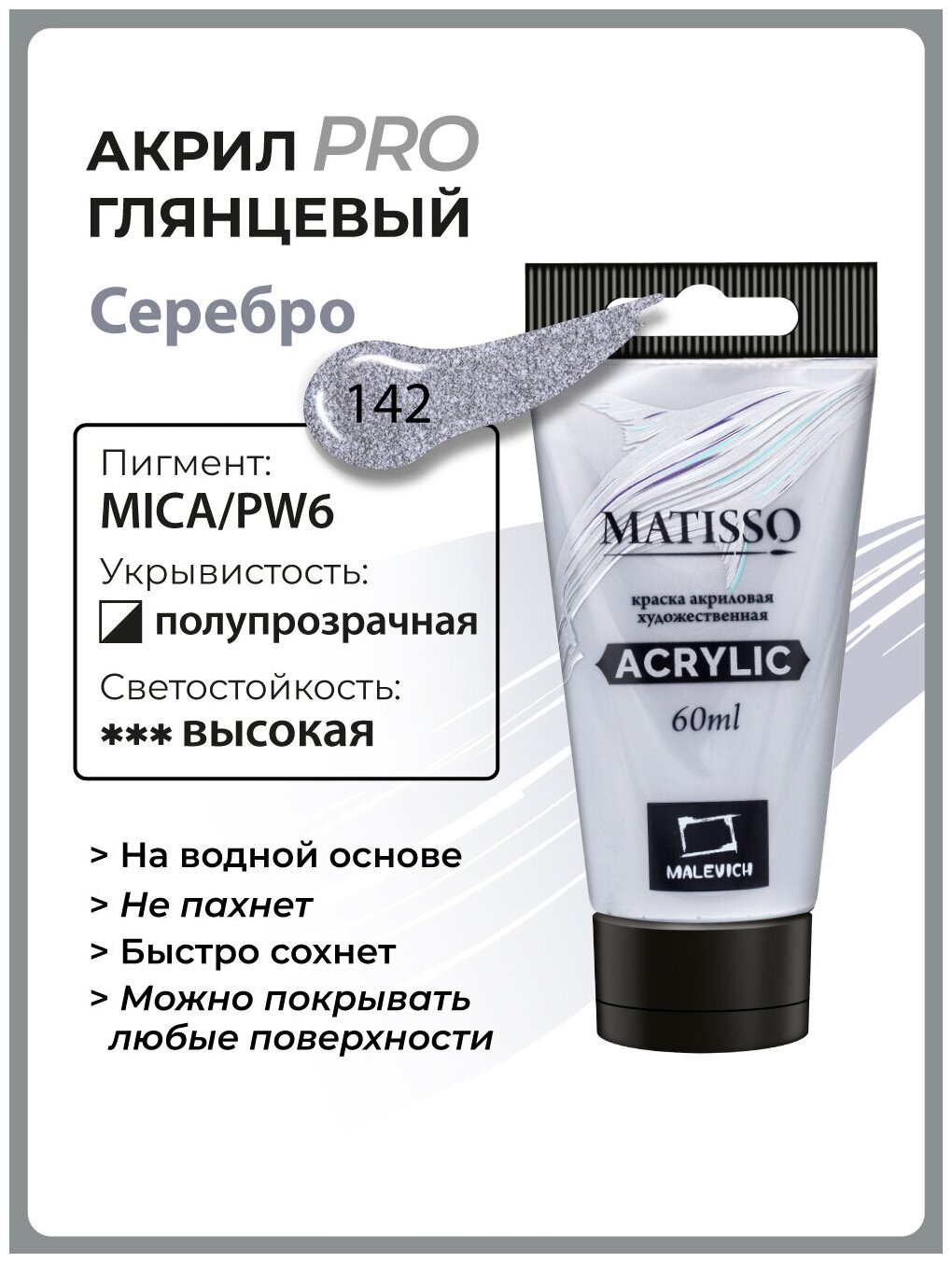 Малевичъ Акриловая краска Малевичъ Matisso, серебро, 60 мл информация: