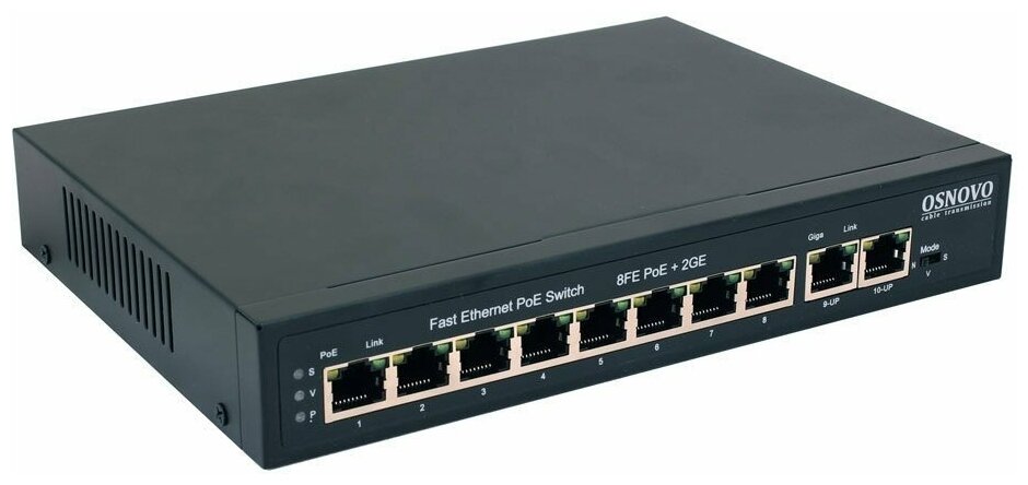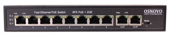 OSNOVO PoE коммутатор, 8 x FE с поддержкой PoE (IEEE 802.3af/at), 2 x GE, до 30W на порт, суммарно д