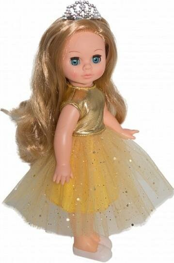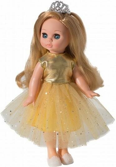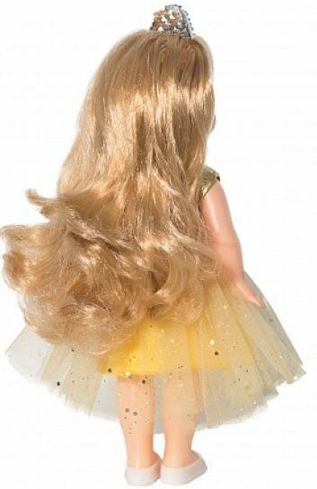 | Комплектация | кукла в одежде (нарядное, золотистое, пышное платье из трикотажной парчи и сетки с блестками), диадема, туфельки |