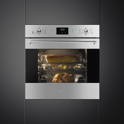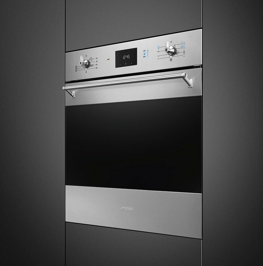 Встраиваемая электрическая духовка Smeg Classica, Многофункциональный духовой шкаф с пароувлажнением, 60 см, 6 функций, нержавеющая сталь с обработкой против отпечатков пальцев, чёрное стекло Eclipse