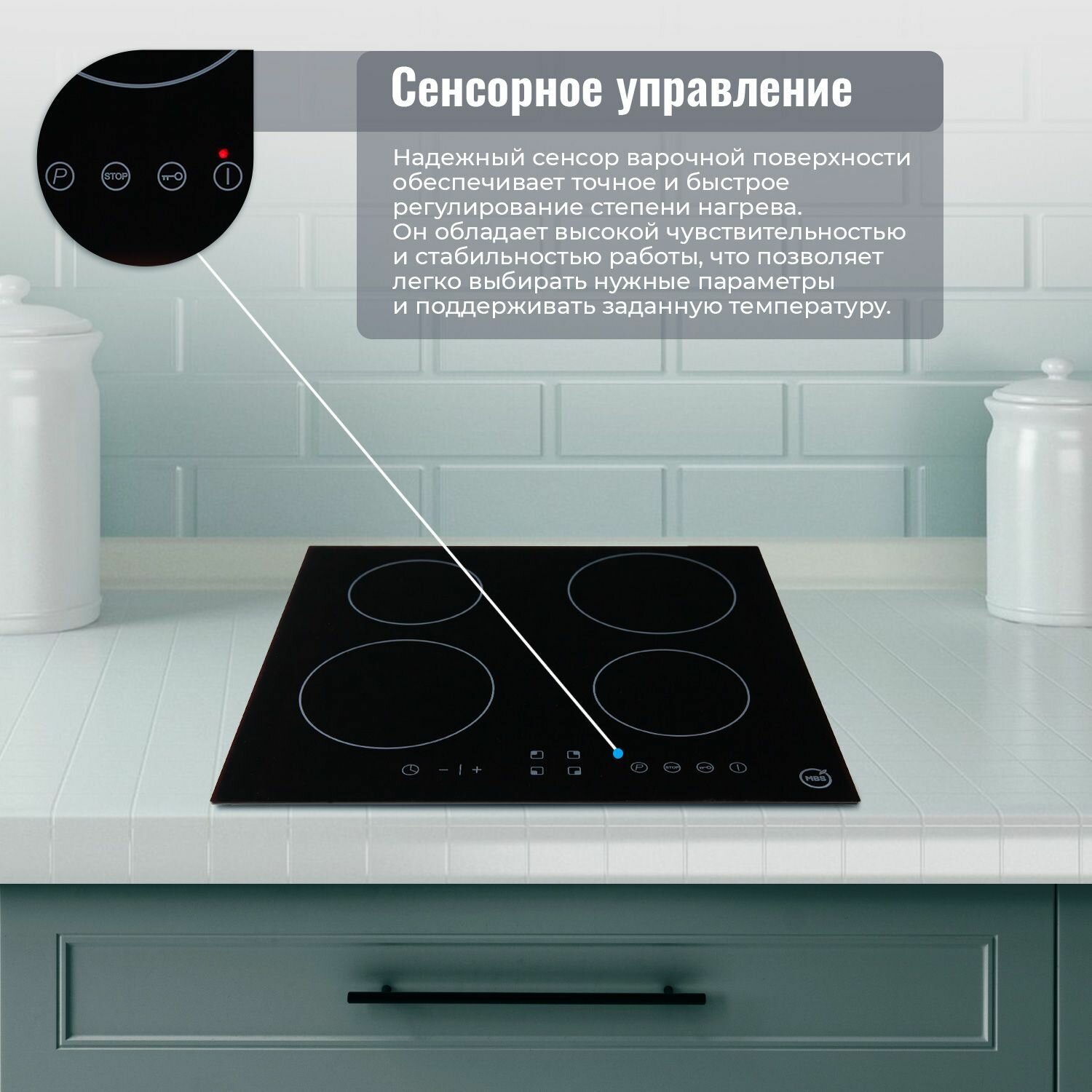 | Безопасность | защитное отключение конфорок / кнопка блокировки панели / индикатор остаточного тепла |