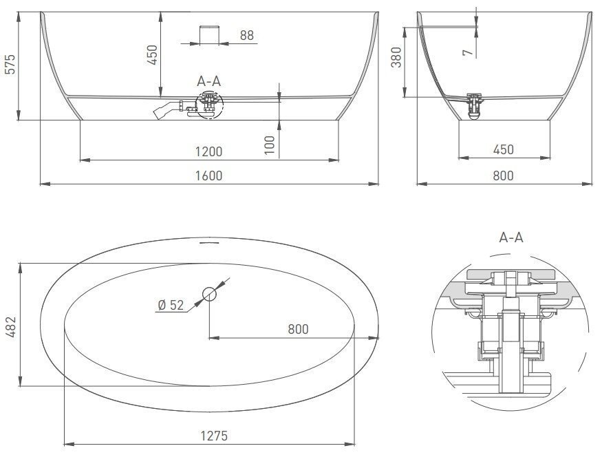 Овальная ванна из литьевого мрамора 1600х800 Salini Alda 101913G Sapirit матовая