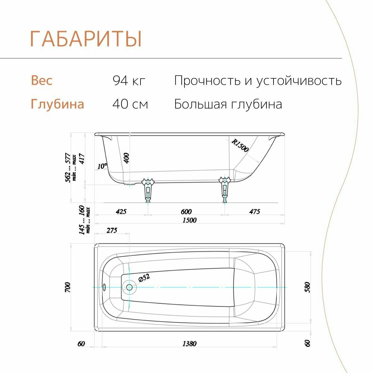 Ванна чугунная tempra Malm 150x70 квадратные ручки информация: