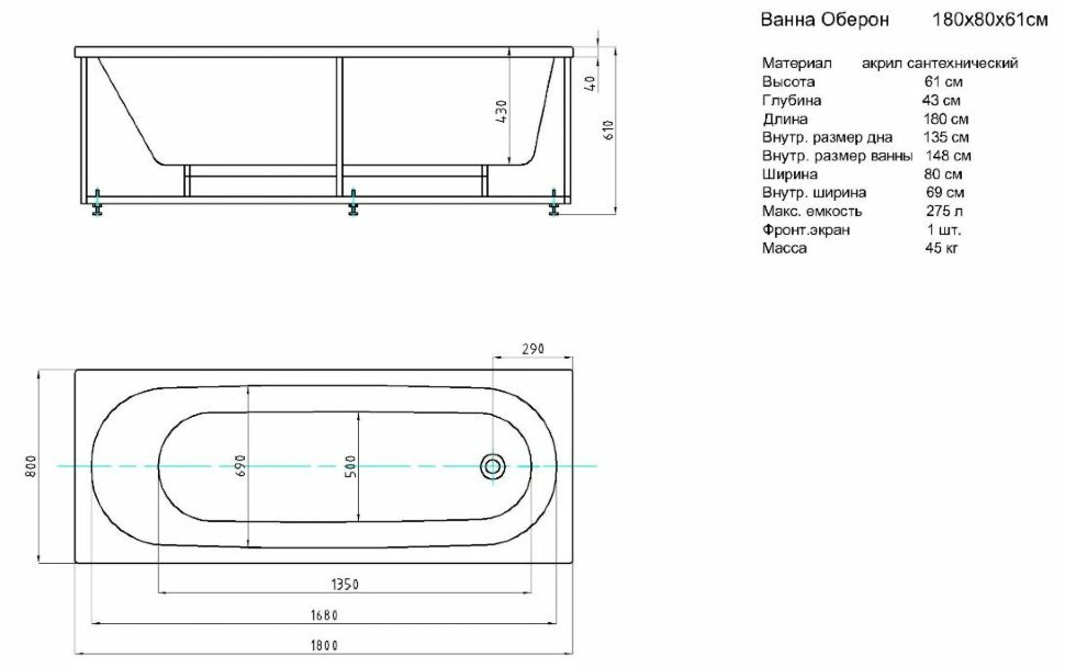 Ванна акриловая Акватек Оберон 180 (без гидромассажа) информация: