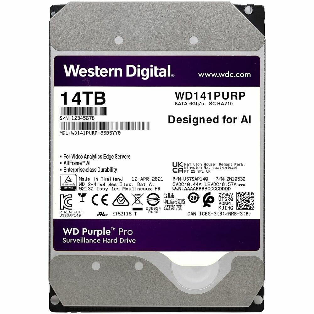 Жесткий диск 3.5" WESTERN DIGITAL WD Purple Pro 14 ТБ, SATA III, 256 Mb, 7200 rpm (WD141PURP)
