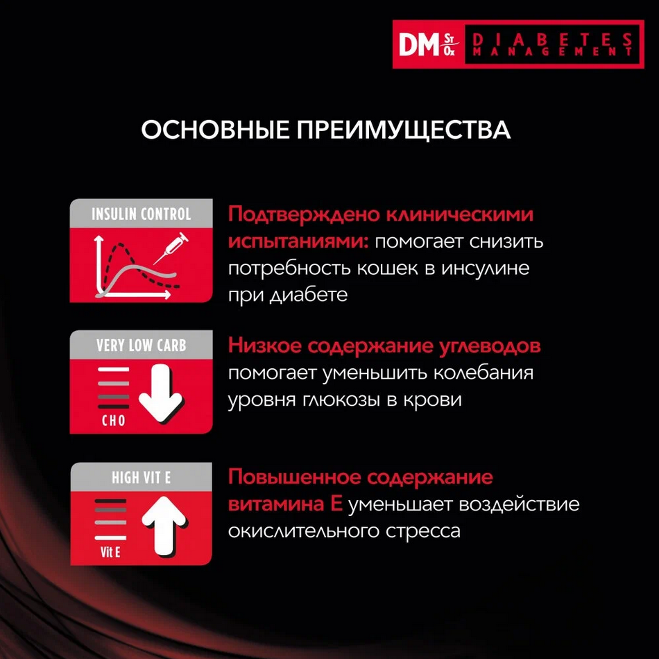 | Дополнительная информация | Перед началом диетотерапии проконсультируйтесь с ветеринарным врачом. Потребности в инсулине могут быть значительно сокращены при использовании этой диеты. Поэтому очень важно, чтобы переход кошки от текущей диеты к DM St/Ox был постепенным, это позволит тщательно контролировать содержание глюкозы в крови. |