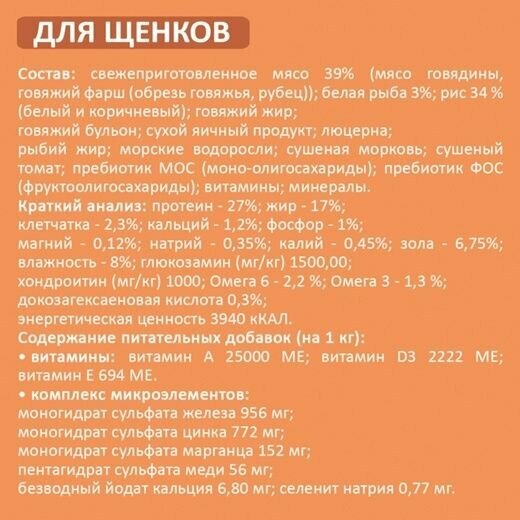 | Состав | Свежеприготовленное мясо 39% (мясо говядины, говяжий фарш (обрезь говяжья, рубец), белая рыба 3%, рис 34 % (белый и коричневый), говяжий жир, говяжий бульон, сухой яичный продукт, люцерна, рыбий жир, морские водоросли, сушеная морковь, сушеный томат, пребиотик МОС (моно-олигосахариды), пребиотик ФОС (фруктоолигосахариды), витамины, минералы. |