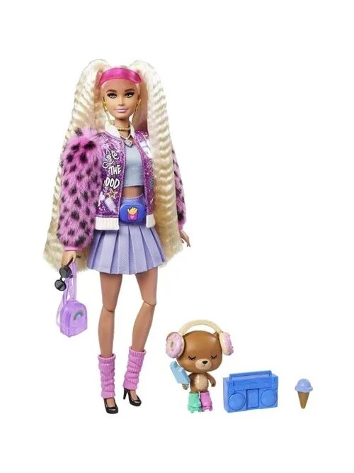| Дополнительная информация | Барби Экстра следует принципу – чем больше модных деталей, тем лучше! В наборе вместе с куклой вы найдете 15 предметов для создания смелого образа – одежду, модные аксессуары и даже забавного питомца! Длинные светлые гофрированные волосы Барби собраны в два хвостика на макушке. Кукла одета в короткую плиссированную юбку и розовую куртку с графическими принтами и “пушистыми” рукавами. Яркий образ дополняют идеально подобранные аксессуары – изящный рюкзак, поясная сумка, очки, розовые гетры, туфли на каблуках и многое другое. Маленький медвежонок на роликах с аксессуарами выглядит просто восхитительно! Отличный подарок для детей, которые обожают моду и любят быть в центре внимания. Игра с куклой Барби “Экстра” способствуют развитию творческого самовыражения детей через увлекательные игры с модными аксессуарами. |
