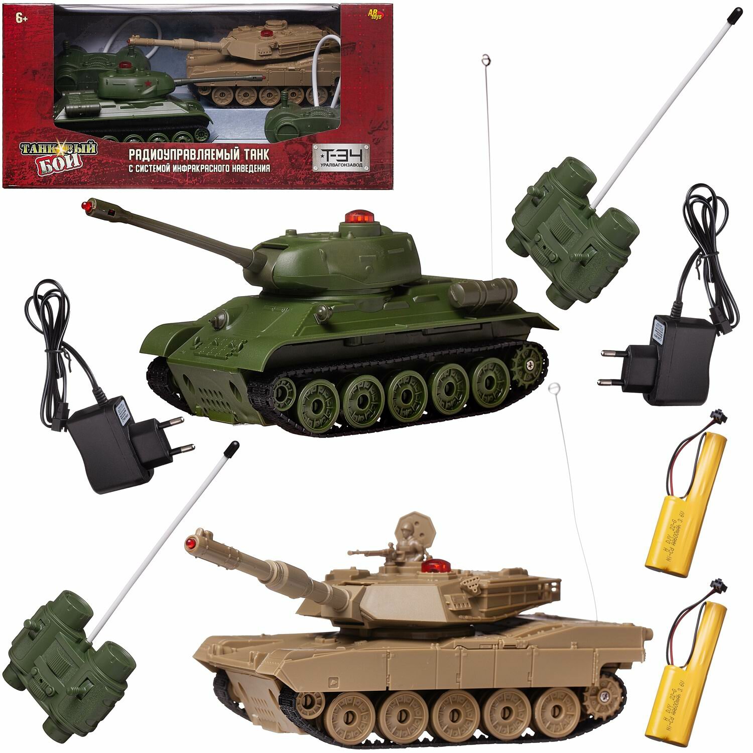 Танковый бой р/у, в наборе: 2 танка (Т34 и Тигр), звуковые и световые эффекты, с зарядным устройством, 27 Мгц, масштаб 1:32 информация:
