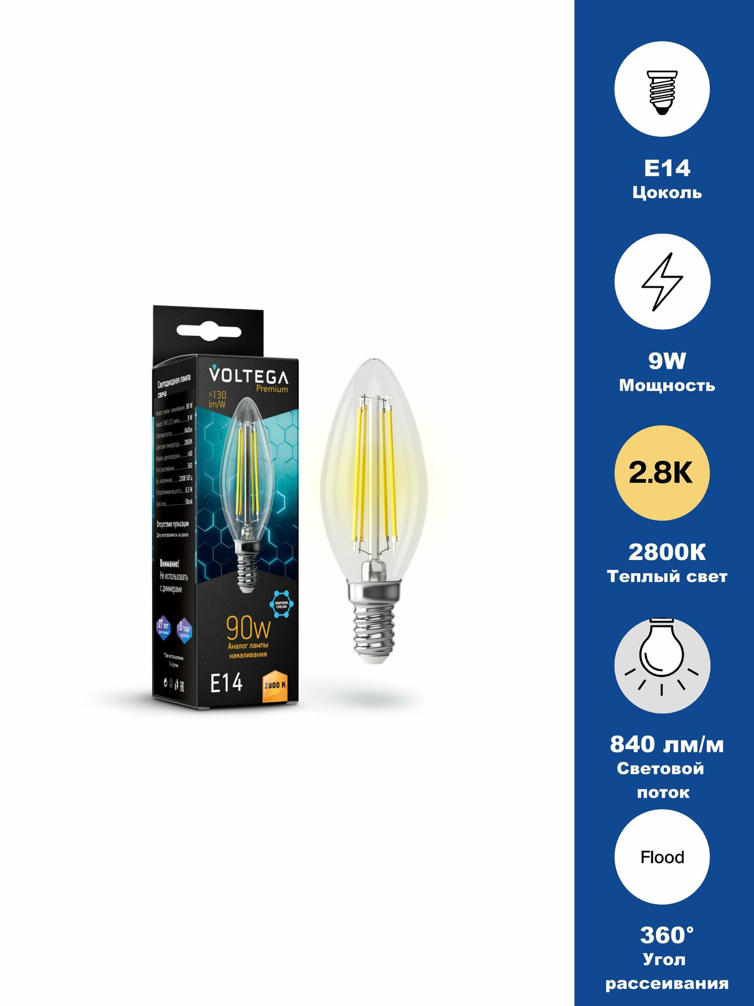 Светодиодная лампа VOLTEGA Свеча E14 2800K 9W Graphene 7134 информация: