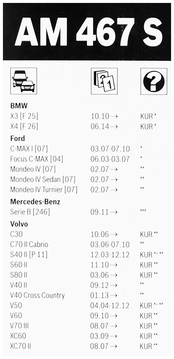 | Модель автомобиля | BMW X3 / BMW X4 / Ford C-Max / Ford Mondeo / Ford Focus / Jaguar F-Pace / Mercedes-Benz B-class / Renault Trafic / Volvo C30 / Volvo C70 / Volvo S80 / Volvo V50 / Volvo V40 / Volvo S40 / Volvo S60 / Volvo V70 / Volvo V60 / Volvo XC70 / Volvo XC60 |