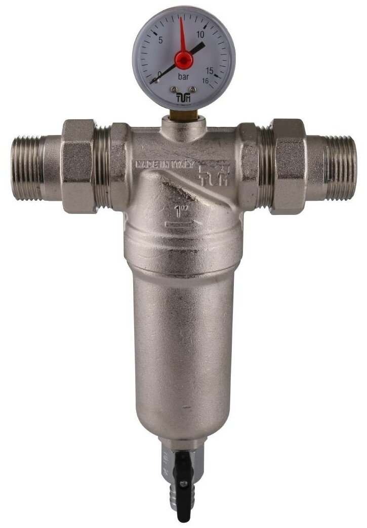 Фильтр промывной с манометром, с разъемными соединениями, латунной колбой TIEMME 1/2"