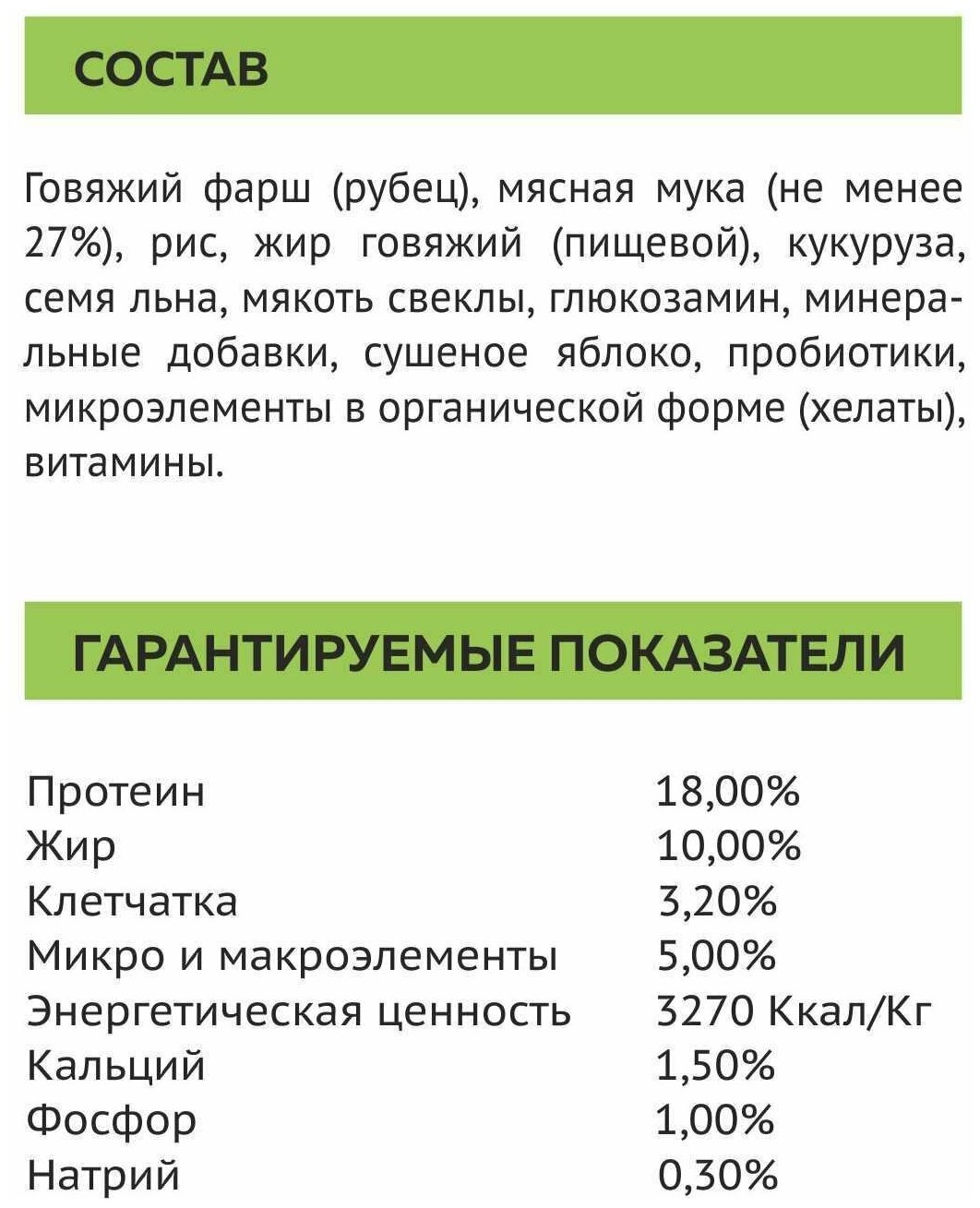 | Состав | говяжий фарш (рубец), мясная мука (не менее 27%), рис, жир говяжий (пищевой), кукуруза, семя льна, мякоть свеклы, минеральные добавки, сушеное яблоко, пробиотики, микроэлементы в органической форме (хелаты), витамины |