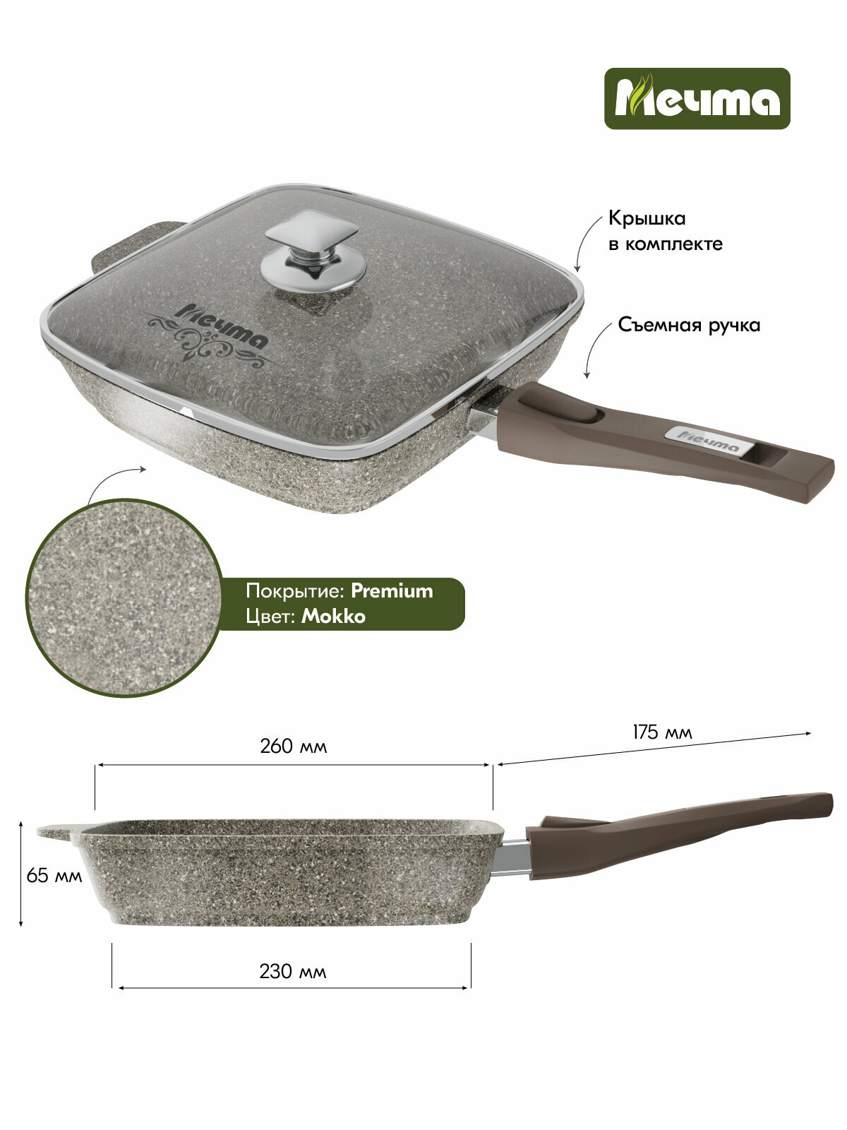 Сковорода квадратная 26*26 см "Premium" mokko со съемной ручкой и стекл. крышкой арт. с027902 (6/1) информация: