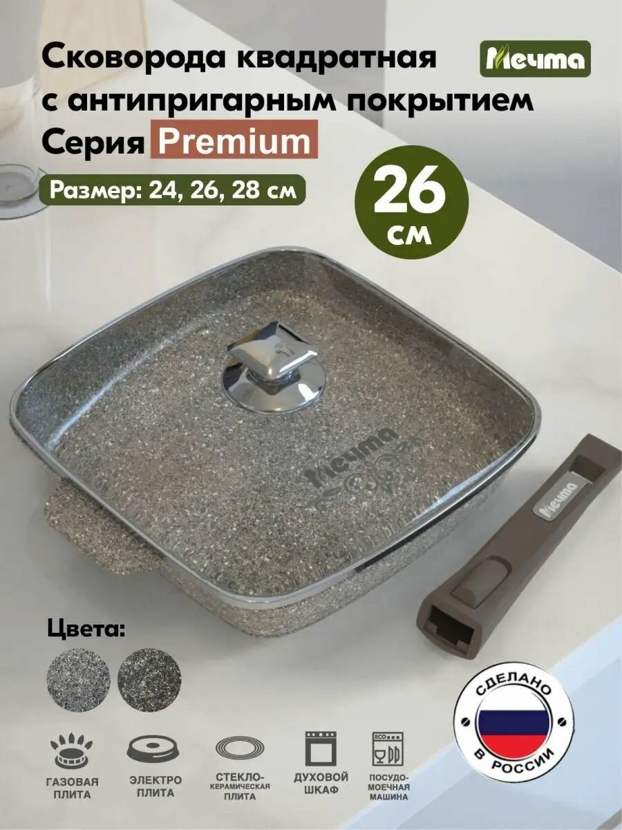 Сковорода квадратная "Мечта" 26*26см Премиум с антипригарным покрытием со съемной ручкой и крышкой, можно мыть в посудомоечной машине