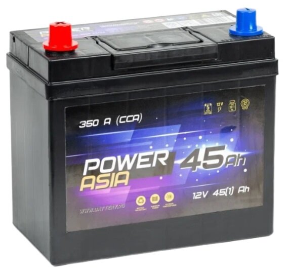 10 цен на Аккумулятор автомобильный POWER Asia 45 А/ч 350 А прям. пол. тонк. кл. 55B24R Азия авто (238x129x227) 2021г