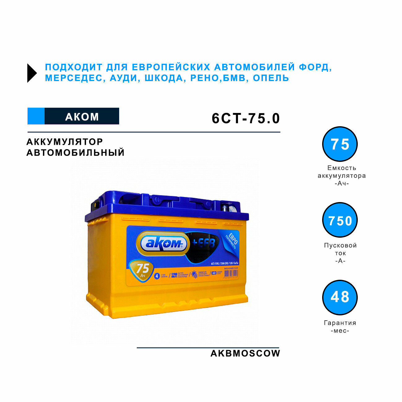 Аккумулятор автомобильный АКОМ 6CT-75.0 75Ач 750A информация: