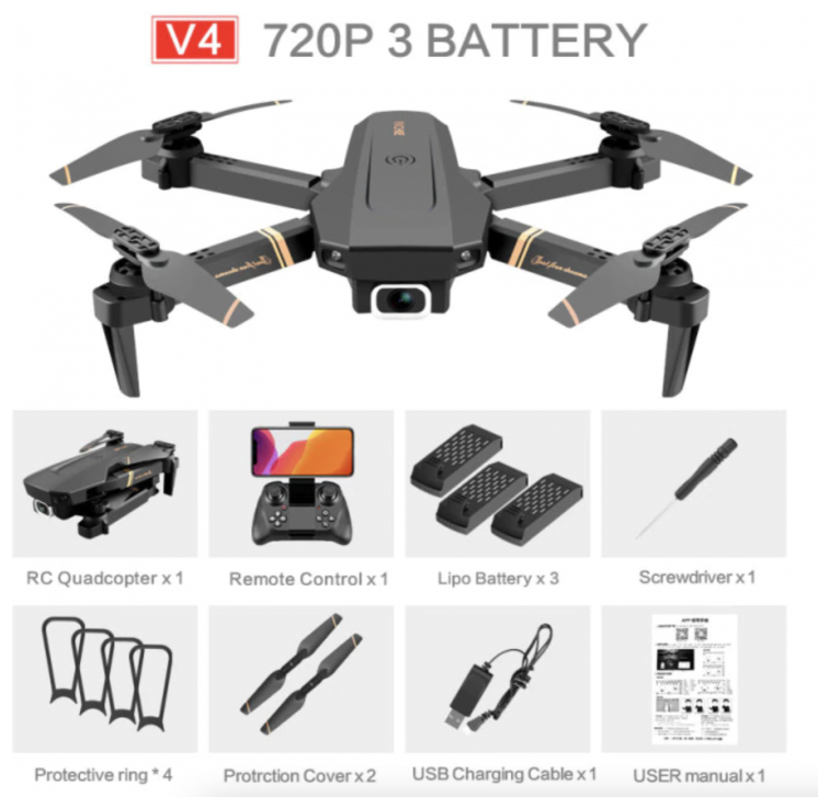 Квадрокоптер V4 дрон 720P, WIFI, FPV, 3 батареи, черный информация: