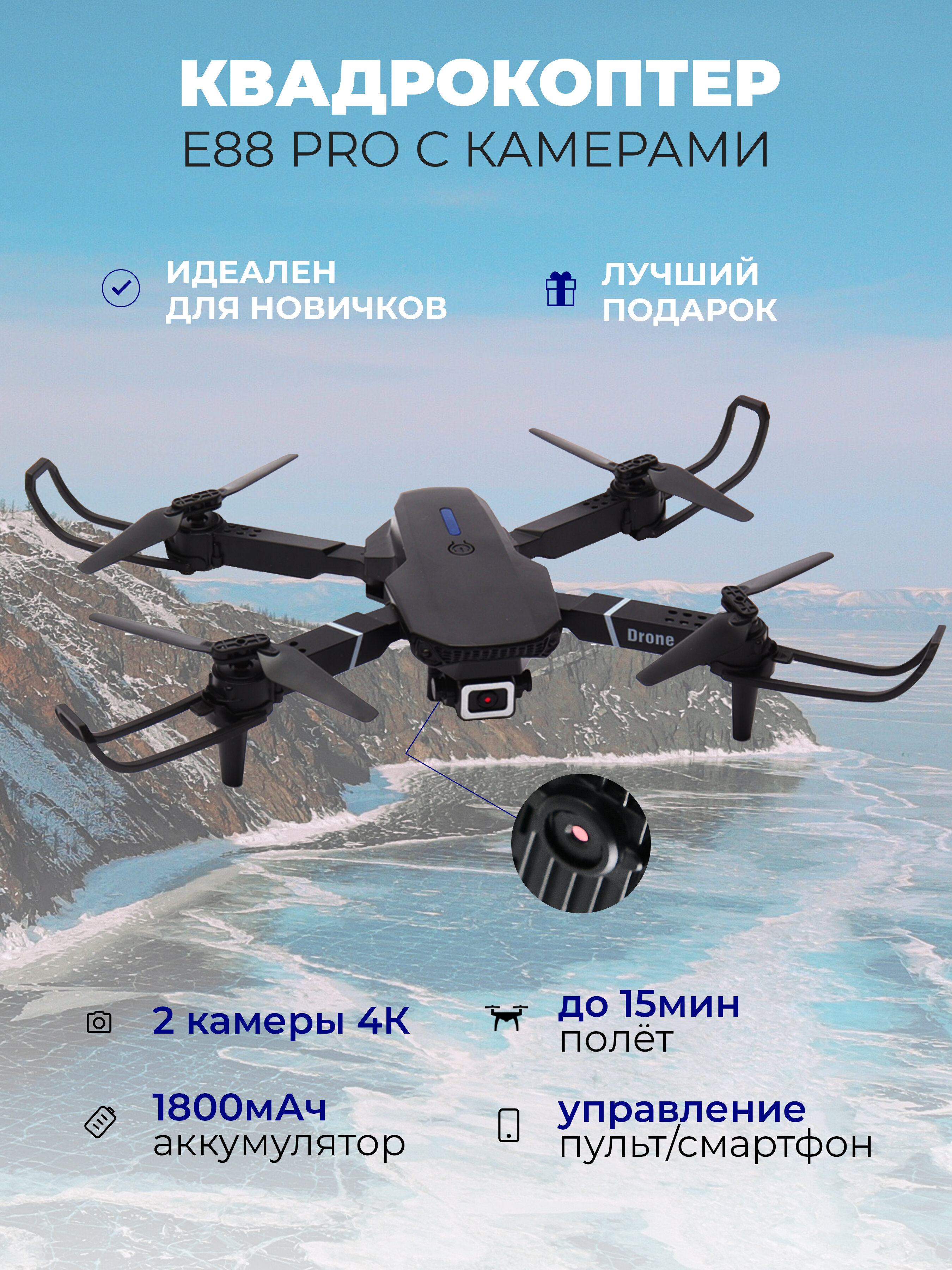 Квадрокоптер E88 Pro с камерой, черный, 2 камеры (4К,HD) информация: