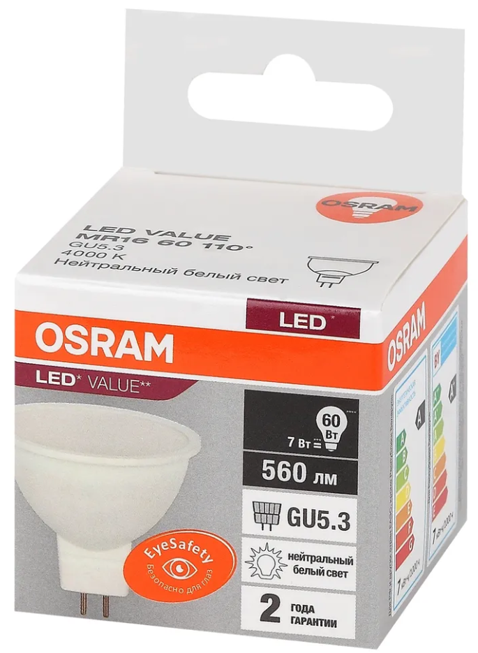 Лампочка светодиодная MR 16 7W GU5.3 220-240V 840 нейтральный белый свет OSRAM информация: