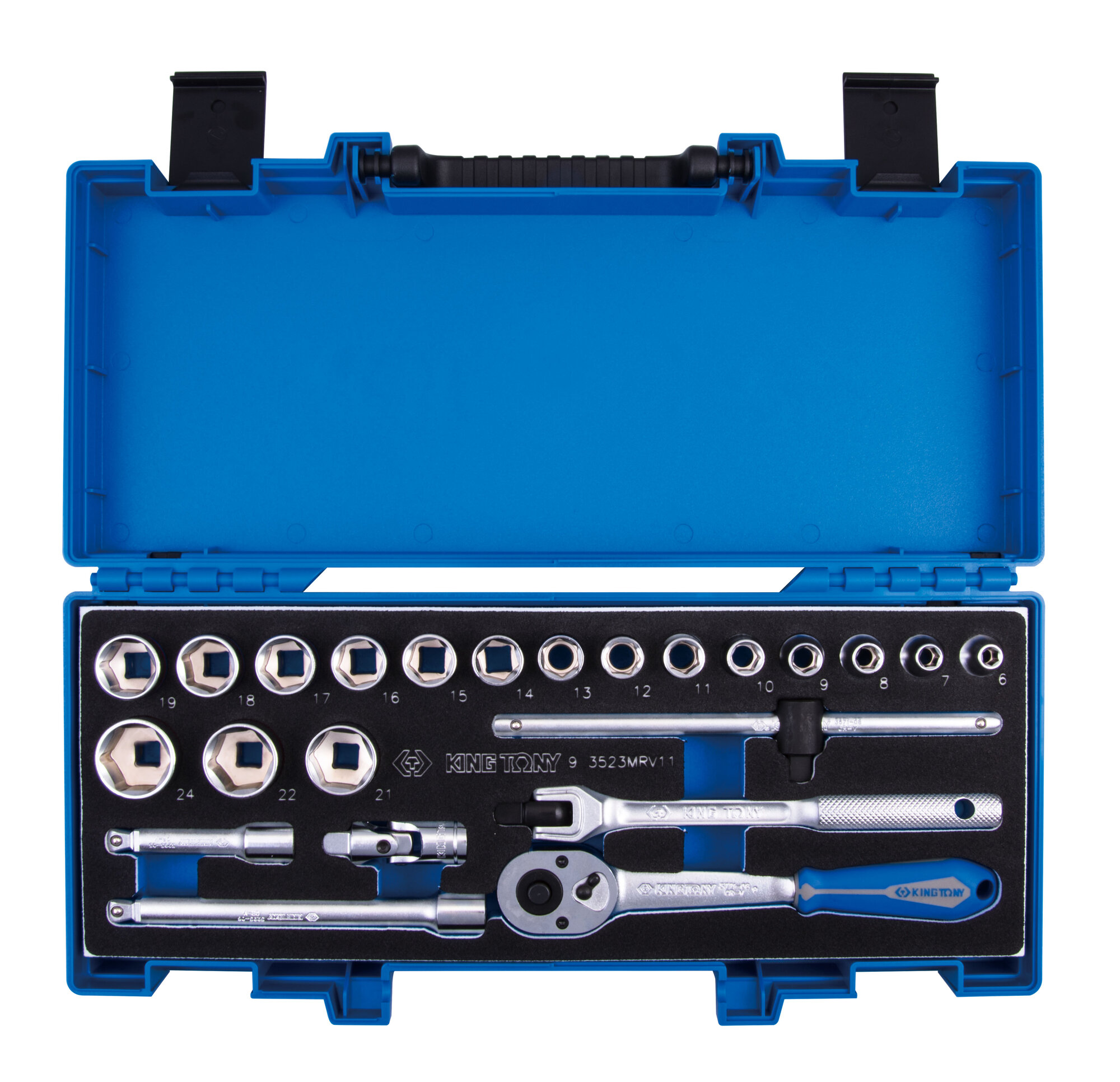 Набор торцевых головок с принадлежностями 3/8", шестигранные, 6-24 мм, 23 предмета KING TONY 3523MRV11 информация:
