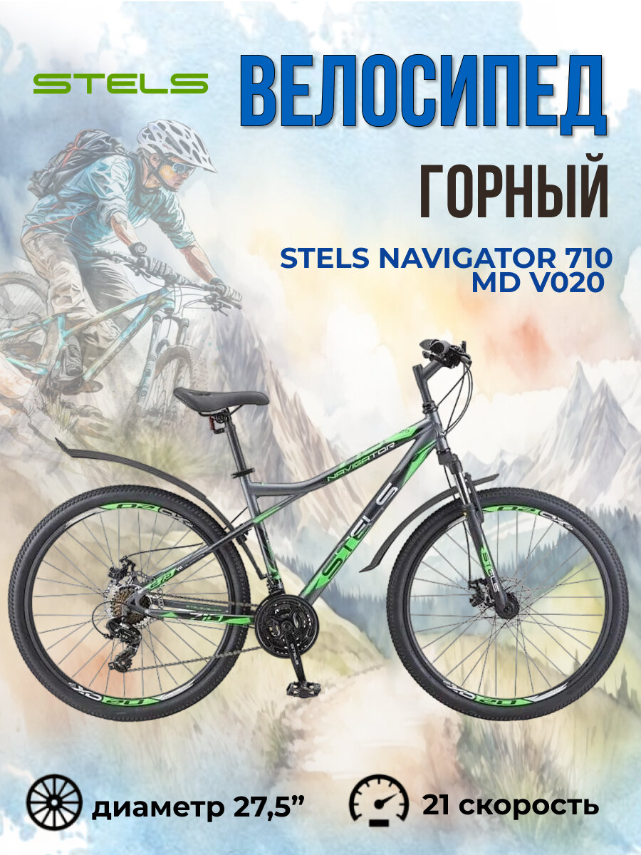 Велосипед горный Stels Navigator 710 MD V020 антрацитовый/зелёный/чёрный с колесами 27.5", рама 16" информация: