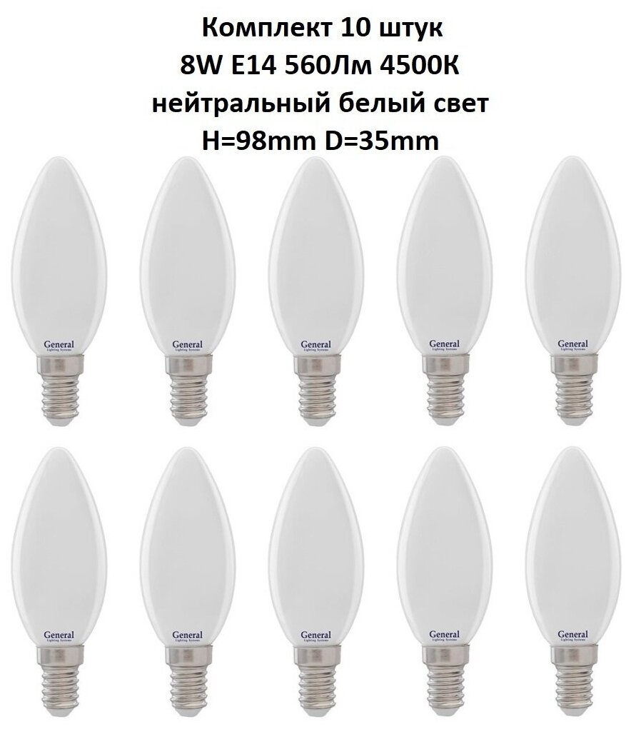 General, Лампа светодиодная филаментная, Комплект из 10 шт., 8 Вт, Цоколь E14, 4500К, Форма лампы Свеча информация: