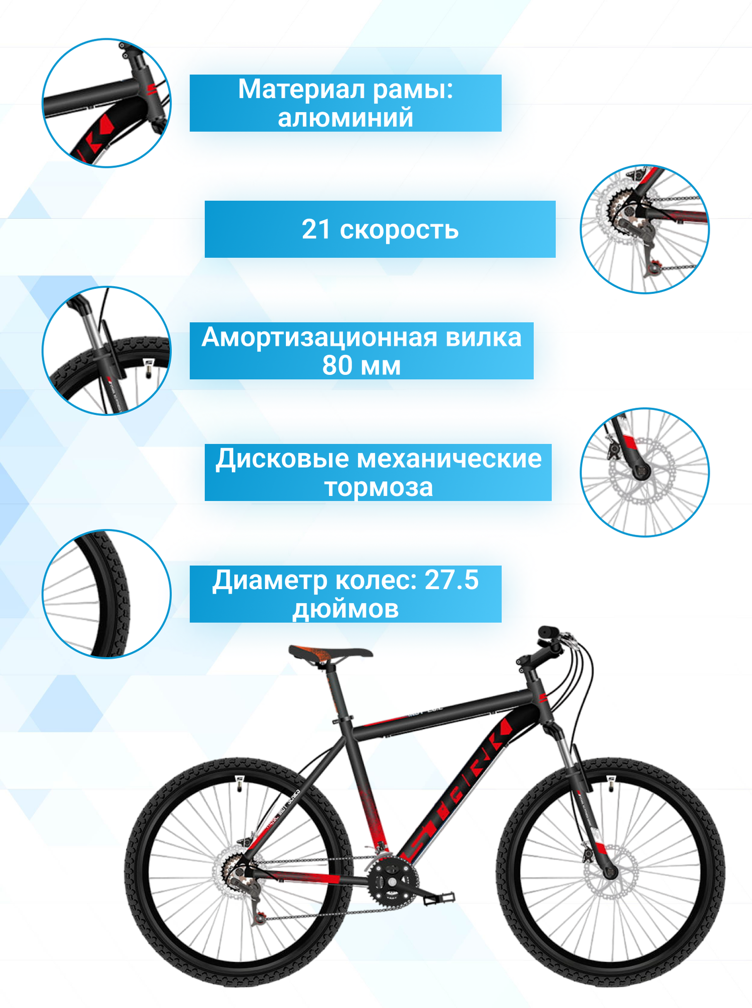Велосипед горный с колесами 27,5" Stark'21 Indy 27.1 D черный/красный рама S (16"), 21 скорость информация: