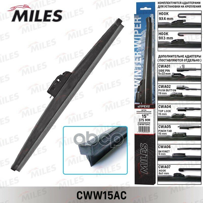 Щетка С/О Зимняя Miles 15/370Мм + Адаптеры Hook 9X3/9X4 Cww15ac Miles арт. CWW15AC