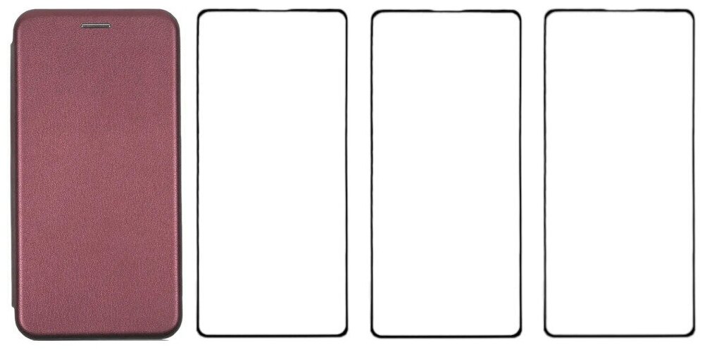 Комплект для iPhone 11 Pro Max: чехол книжка бордовый + три закаленных защитных стекла с черной рамкой на весь экран / Айфон 11 Про информация: