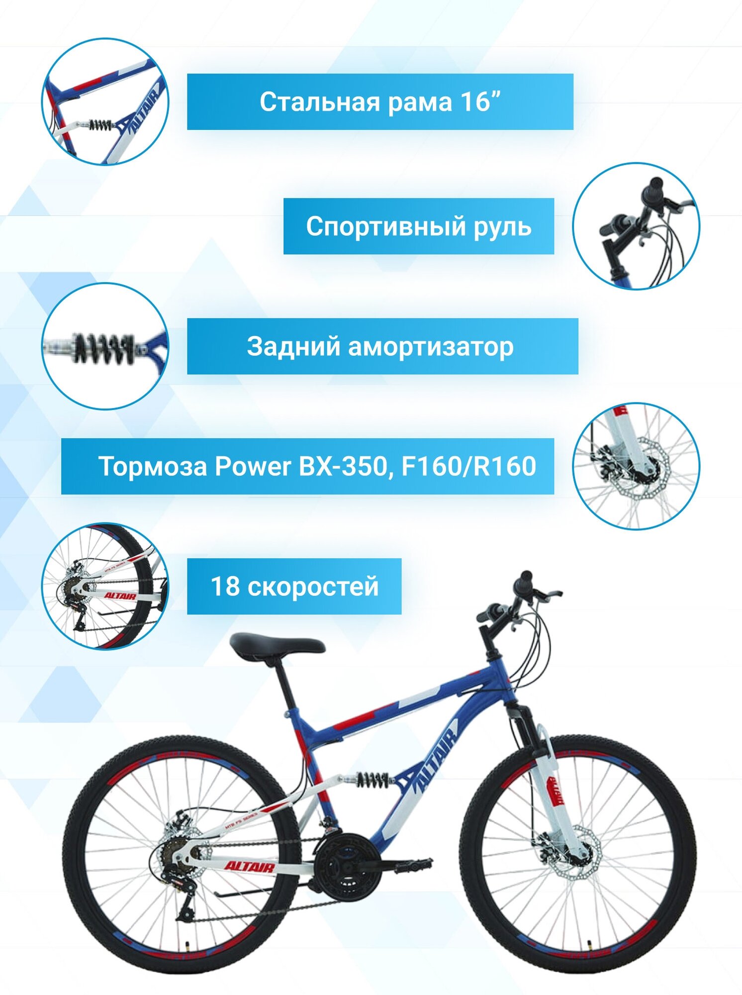 Велосипед горный с колесами 26" Altair MTB FS 26 2.0 D сине-красный 18 скоростей рама 16" информация: