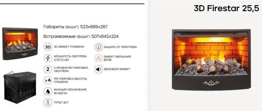 Электрокамин RealFlame Carolina Marble 24/25.5 WT-F512 с очагом 3D Firestar 25,5 информация: