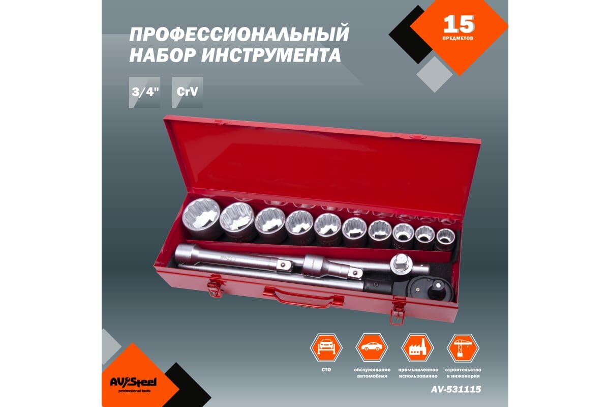 Набор инструмента "AV Steel" 15 предметов 3/4", профессиональный в металлическом кейсе информация: