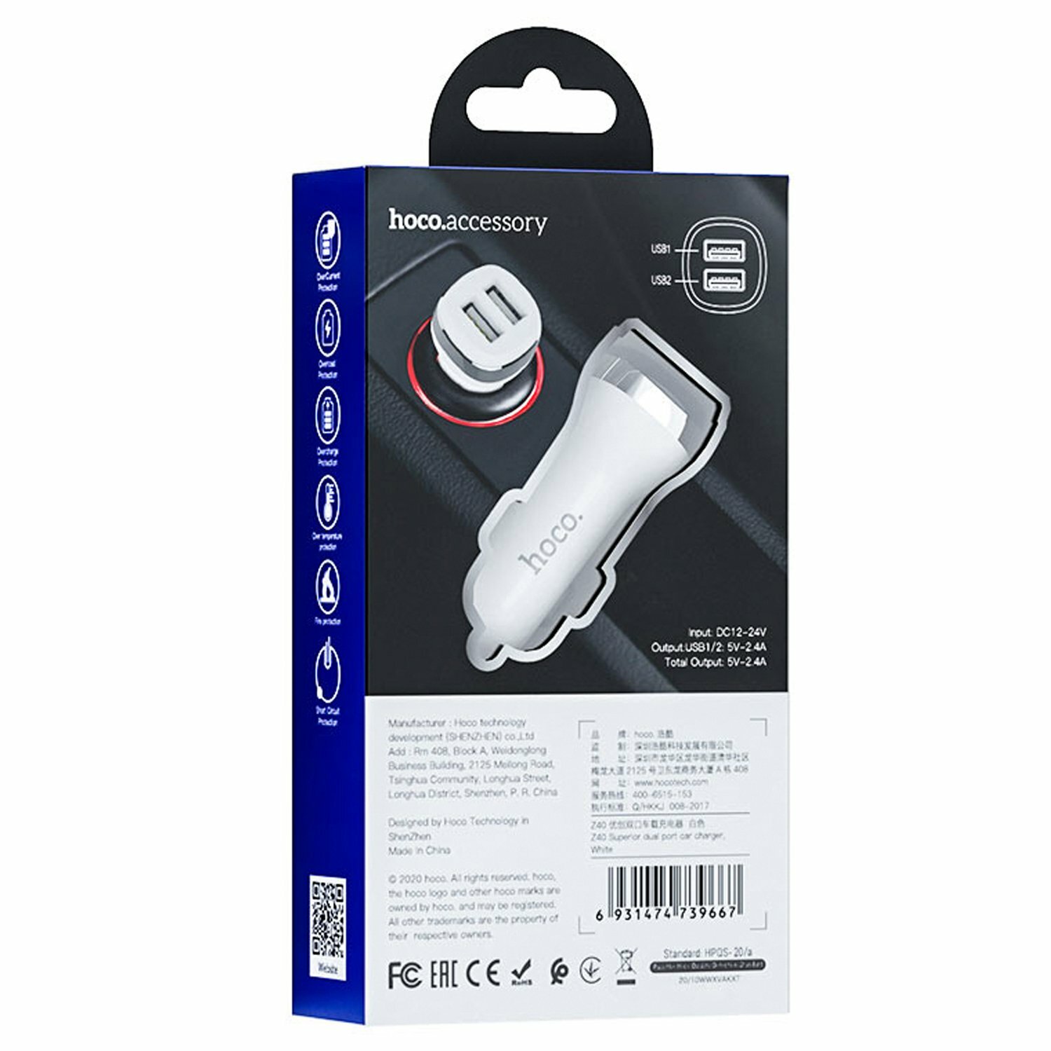 Автомобильное зарядное устройство (универсальное) Hoco Z40 (2USB/5V/2.4A) (белое) информация: